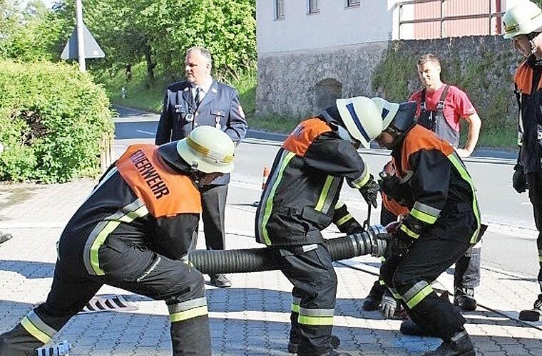 13 Mitglieder der Egloffsteiner Feuerwehr spielen die bei einem Einsatz nötigen Abläufe durch. Als Lohn gibt es Auszeichnungen.