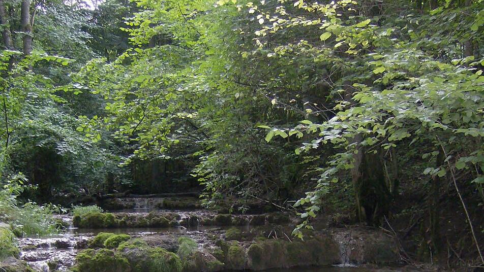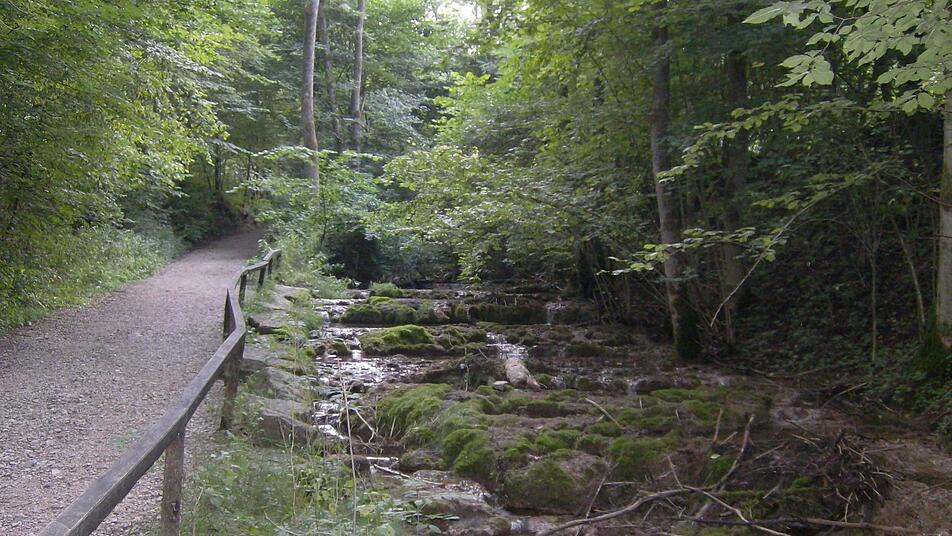 Holzbänke und Tische entlang der Tuffkaskaden und im Wald, direkt an der Lillachquelle, die aus einer Höhle im Felsen entspringt, laden zur ersten Vesperpause ein.