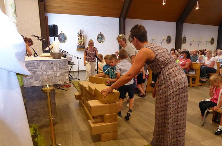 Für die musikalische Begleitung sorgte die Kirchenband "Tabor". "Heute stehen sie im Mittelpunkt - die Kinder" betonte Pater Weierstraß in seinen Grußworten. Auf lebendige Weise hatte der Reuther Nachwuchs auch mitgeholfen, den Gottesdienst zu gestalten. Da war zum Beispiel die Geschichte vom neuen Haus zu hören. Da war auch der symbolische Bau einer Mauer mit Kartons zu sehen. Spannend und interessant war das Interview, das Kim, Kora und Lilly - sie alle sind ehemalige Kindergartenkinder - mit Theo Leppert und Betti Hartwig führten.