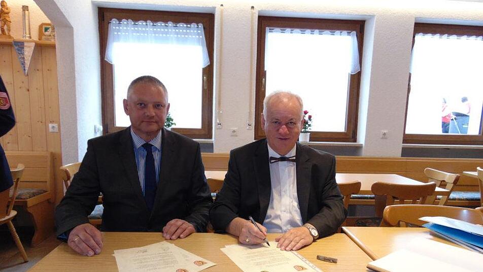 Nach der Gebietsreform in der Partnergemeinde regte der dortige Bürgermeister an, die Partnerschaft auf die gesamte Gemeinde Dohma zu erweitern. Der Gemeinderat Weißenohe stimmte dem Vorschlag zu und anlässlich der Jubiläumsfeier der Feuerwehr sollten nun die schön gestalteten Urkunden unterzeichnet werden. Dazu trafen sich Bürgermeister Matthias Heinemann aus Dohma und Gastgeber Bürgermeister Rudolf Braun in den erweiterten und neu gestalteten Räumen der Feuerwehr.