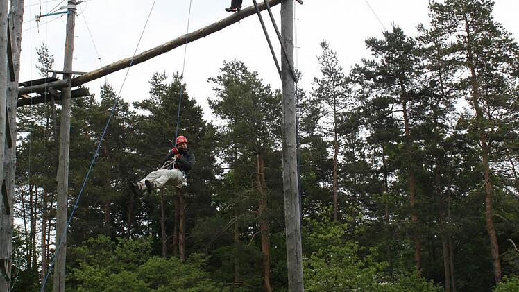 Im Hochseilgarten auf Burg Feuerstein lassen sich in diesen Tagen Männer und Frauen zu Trainern ausbilden. Sie müssen sich dabei in Theorie, vor allem aber in luftiger Höhe bewähren.