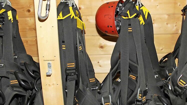 Es wirkt riskant und gefährlich, das Gelände des Hochseilparcours neben der Burg Feuerstein. Wer hier herumläuft, wird deshalb auch sofort von den Ausbildern oder Trainern angewiesen, sich umgehend einen roten Helm aus der kleinen Hütte zu holen und ihn vor allem auch aufzusetzen. Sicherheit, das wird jedem Besucher sofort klar, wird hier ganz groß geschrieben.