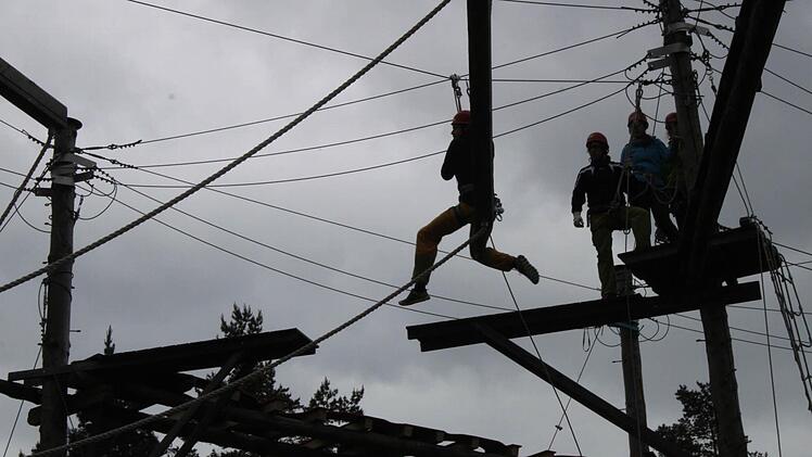 Gemeinsame Übungen Aber sie haben einen gesunden Respekt vor der Höhe. Gleich am zweiten Tag geht es auf den Hochseilparcours. Die Auszubildenden nehmen die Rolle von Teilnehmern ein. Immer zwei Teilnehmer üben gemeinsam.