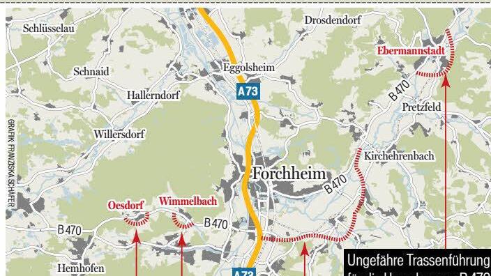 Ob der den Ebermannstadtern besser gefällt als der "rote Schlenker", der in der Vorauswahl erwogener Straßenbauprojekte des Bayerischen Innenministeriums eingezeichnet ist, bleibt abzuwarten. Bürgermeisterin Christiane Meyer (NLE) jedenfalls äußert sich in einem Video des BN recht kritisch zu einer Umgehung von Ebermannstadt. Der Bau der Ostspange der Bundesstraße B 470 um Forchheim herum bringe zusätzlichen Verkehr nach Ebermannstadt, das Nadelöhr zur Fränkischen Schweiz. Die Folge: Auch Ebermannstadt soll in den Bundesverkehrswegeplan aufgenommen werden.