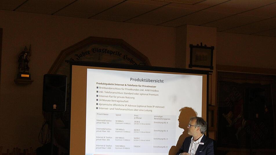 Deren Leiter Infrastruktur, Martin Dorn, zeigte den Bürgern, wie die Hausanschlüsse aussehen werden. Wichtig war den Menschen, dass sie zukünftig Glasfaser bis ins Haus erhalten. Dorn sagte zu, dass die Betreiberfirma Dienstleister und Handwerker vor Ort schulen wolle, damit diese das Anschließen der Telefonanlagen im Haus durchführen können. Die Zuhörer waren sehr an Preisen interessiert. Johannes Bisping erklärte, dass sie sich an den Preisen orientieren, die aktuell am Markt sind. Zum Beispiel sollen bei einer Vertragslaufzeit von zwei Jahren Internet und Telefon bei 50 Megabit Übertragungsrate in der Sekunde monatlich 39,90 Euro kosten. Es fallen einmalige Kosten für das Einrichten in Höhe von 69 Euro an. 100 Mbit kosten 44,90 Euro und 1000 Mbit 199 Euro monatlich. Auf die Frage, wie viele Telefonnummern in diesen Preisen enthalten seien, antwortete Bisping, dass das eine sei; es gebe aber Pakete mit bis zu zehn Nummern und man könne bei anderen Paketen Fernsehen mitbuchen.