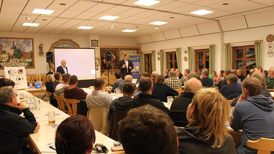 Johannes Bisping versicherte den Zuhörern, dass seine Firma auch beim Anbieterwechsel behilflich sein werde. "Lassen sie sich nicht verunsichern", riet Bisping und fragte nach der aktuellen Übertragungsrate, die ihn ein wenig überraschte: Denn die liegt bei den meisten Hohenpölzer Haushalten bei 0,3 Mbit. Auf die Frage, wann der letzte Haushalt angeschlossen werde, antwortete Martin Leybold von der Firma Lemka, dass dies Ende 2020 der Fall sei. Ein Bauzeitplan liege allerdings noch nicht vor. Die Zentrale soll in der Nähe von Traindorf entstehen, von hier aus sollen die Haushalte angeschlossen werden. Das führte zu Lachen im Publikum und der Aussage einiger: "Da können wir mal wieder warten." Ein Bürger fragte nach der Mindesttiefe, in der die Leerrohre verlegt werden sollen. Leybold antwortete, dass das 60 Zentimeter auf Privatgrundstücken und unter Gehsteigen seien, 90 Zentimeter unter Staatsstraßen und 120 Zentimeter unter Kreisstraßen. Außerdem erklärte er einem Zuhörer, dass vorhandene Leerrohre genutzt werden sollen. Er wies darauf hin, dass die Hausanschlüsse jetzt kostenlos seien, in einigen Jahren bis zu 4000 Euro kosten können. Leybold informierte die Bürger, dass sie in den nächsten Tagen eine Nutzungsvereinbarung erhalten. Diese soll unterschrieben zurückgesendet werden, damit die Handwerker die Grundstücke betreten dürfen. "Das ist aber noch kein Vertrag mit der Betreiberfirma", stellte er klar. "Wenn wir die schnell unterschreiben, werden wir dann schneller angeschlossen", fragte eine Dame nach. Martin Leybold schloss sich mit Geschäftsleiter Rüdiger Schmidt und Johannes Bisping kurz und meinte, dass sie klären wollen, ob nicht Gemeinden mit geringer Übertragungsrate schneller angeschlossen werden können. Dazu applaudierten die Zuhörer.