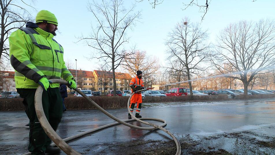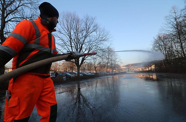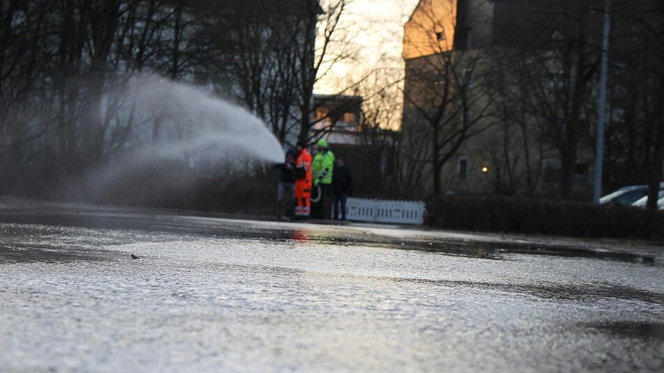 Vor dem Königsbad sollen die Forchheimer bald kostenlos Eislaufen können. Dafür wurde am Freitagnachmittag der Parkplatz in der Käsröthe 4 bewässert.
