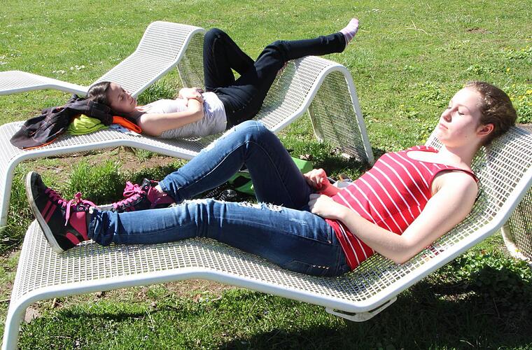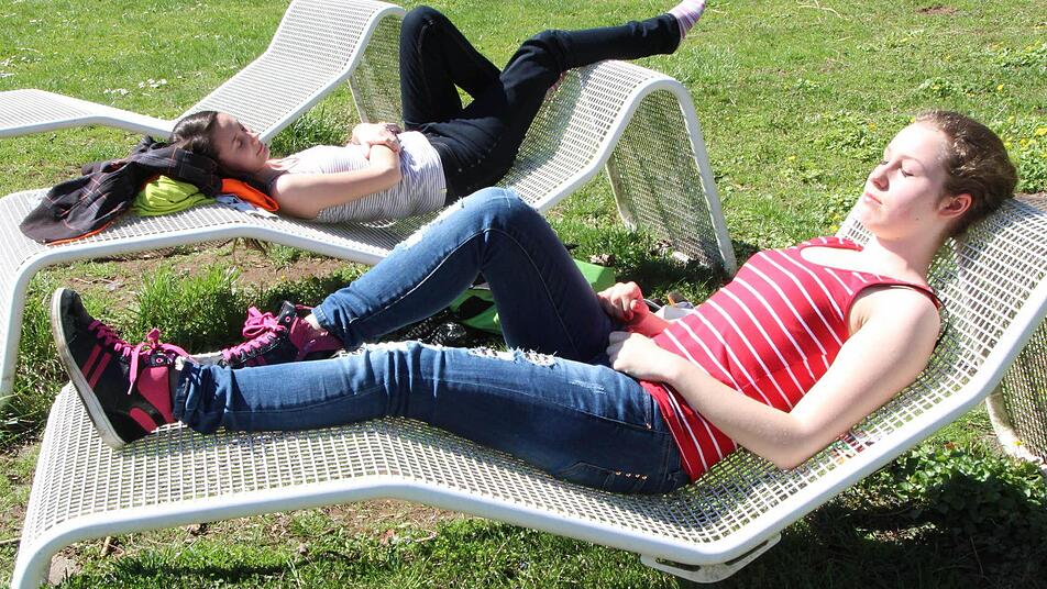 Die Schülerinnen Julia Stumpf und Alicia Schierhalt nutzen die Mittagspause, um im Stadtpark zu entspannen und Sonne zu tanken.