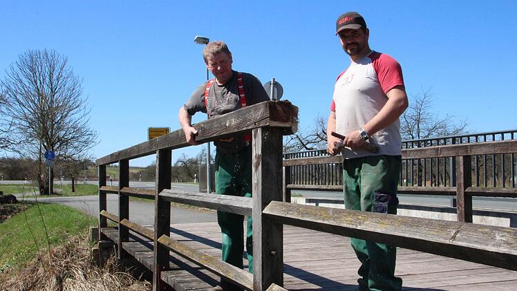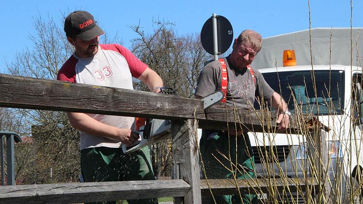 Gerd Windisch und Konrad Igel vom Pretzfelder Bautrupp sind dabei, die morschen Geländer entlang der Radwege zu reparieren. "Das beim Sportplatz ist bereits fertig", freut sich Igel. Doch auf ihn und seine Kollegen wartet nun jede Menge Arbeit.