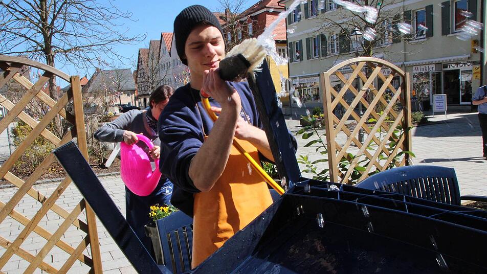 Im Gasthaus Schwanenbräu in Ebermannstadt wäscht Dominik mit einem Gartenschlauch die Sitzgruppen...