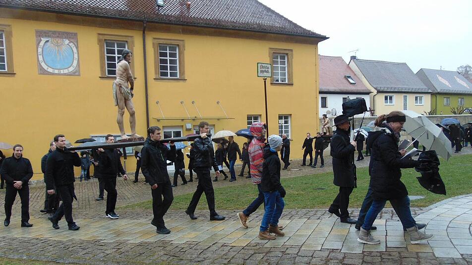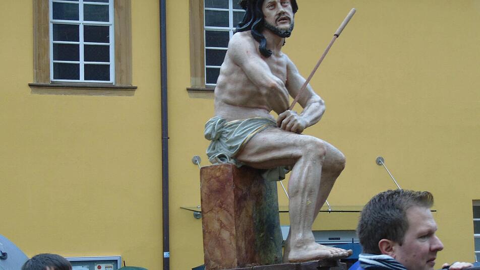 Während die Besucher und Gäste aus Neunkirchen, den Ortsteilen und Nachbargemeinden unter aufgespannten Regenschirmen vor der St.-Michael-Kirche auf den Beginn der Prozession warten, sind die Organisatoren in der Kirche noch mit den letzten Vorbereitungen beschäftigt und schieben Schaumstoff über die Holzträger, auf denen die lebensgroßen geschnitzten Jesus-Figuren angebracht sind. Diese bis ins liebevolle Detail von schnitzkundigen Handwerksmeistern geschaffenen Figuren erzählen und veranschaulichen am Todestag, dem Karfreitag, das Leiden des Herrn Jesus Christi.