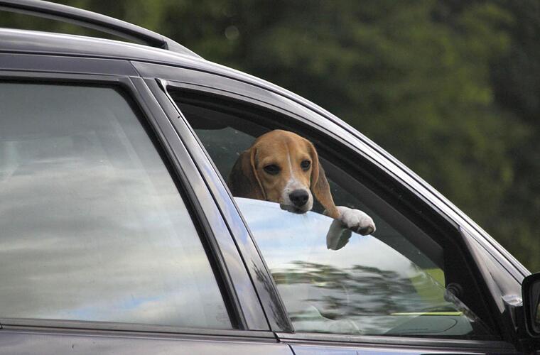 "Ich kann gar nicht hinsehen, wie mein Herrchen heute wieder fährt! Da wird's mir ja hundeelend. Deshalb hab' ich lieber das Fenster einen Spalt geöffnet."
