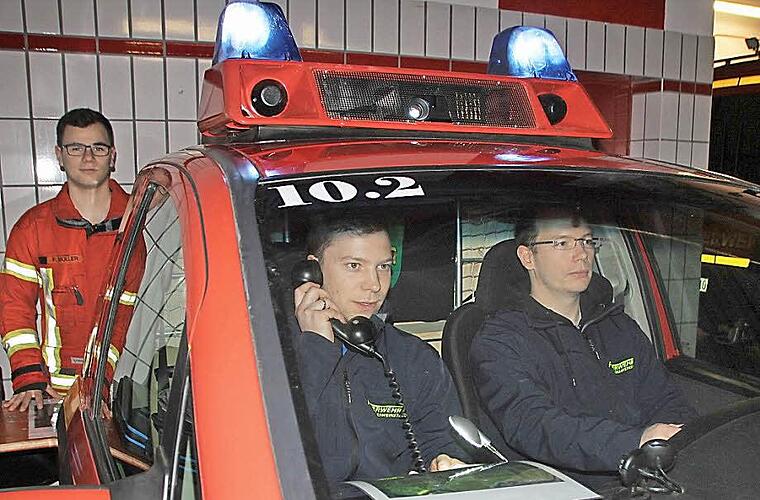 "Ein toller Weg, um sich für den Notfall im Alltag fit zu machen", sagt Gruppenführer Marco Hoffmann, der das Fahrzeug an diesem Abend lenkt. Neben ihm gibt Kommandant Marcel Zweck gerade eine Erhöhung der Alarmstufe weiter. Die Leitstelle wird vom zweiten Kommandant Fabian Müller imitiert, der hinter dem Simulationsfahrzeug steht und von dort aus die Technik steuert.