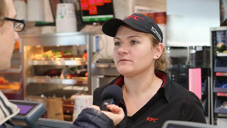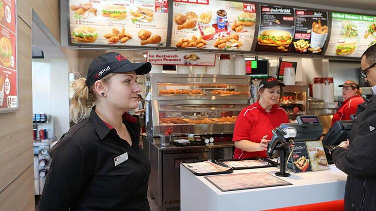 Das Fett ist heiß, die Mütze sitzt, Colonel Sanders grinst von oben: "Willkommen bei KFC. Mein Name ist Aytug. Was kann ich für Sie tun?", fragt Aytug Okcün aus Forchheim in die Sprechanlage. Jacqueline und Tochter Tamara hocken ein paar Meter weiter in ihrem Auto vor dem Drive-In-Schalter und überlegen noch, was genau auf dem Teller landen soll. "Wir möchten die Acht und die Zehn. Den Burger mit Käse bitte", sagt Jacqueline, während sie sich aus dem Fenster lehnt, um besser in die Anlage sprechen zu können.
