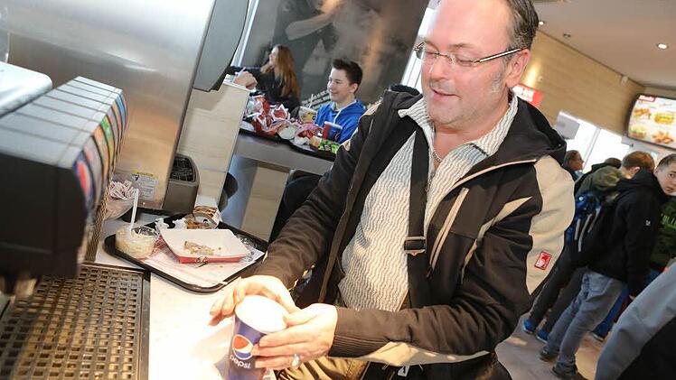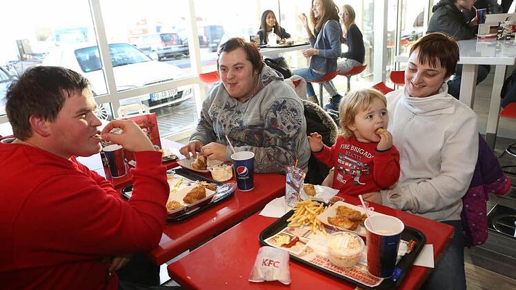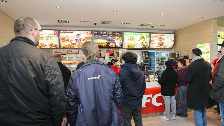 Fans der amerikanischen Fast-Food-Kette sind Mama und Kind noch nicht. "Ich wollte erst Döner essen", sagt die Tochter. "Aber dann wollten wir das mal ausprobieren", sagen die beiden und rollen ein paar Meter weiter zur Essens-Ausgabe. In der Küche wandern die Hähnchenteile für Mutter und Tochter direkt in die Fritteuse. Wer nicht mit dem Auto gekommen ist, muss sich auf eigenen Beinen in den Laden schleppen und in die Schlange der hungrigen Mägen einreihen.