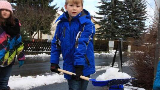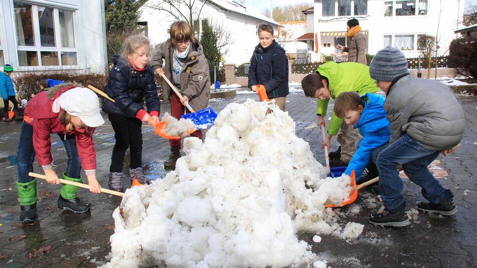 Auf dem Pausenhof in Wiesenthau haben die Kinder während der Mittagspause zum ersten Mal Gelegenheit, die bunten Schneeschaufeln auszuprobieren, die der Elternbeirat angeschafft hat. Jedes Krümelchen Schnee, das sie finden, tragen sie zu einem großen Haufen zusammen. Was daraus entstehen soll, darüber sind sich Rebekka, Maximilian und die anderen noch nicht recht schlüssig: "Vielleicht schneit es ja noch einmal, dann können wir den Haufen aushöhlen und ein Schneehaus bauen. "