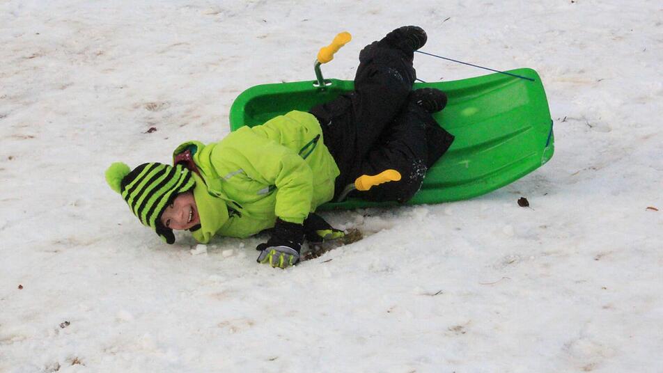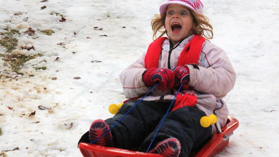 Der kleine Hügel vor dem Kindergarten ist ein Paradies. Von hier aus rutschen die Kleinen hinunter bis zum Pfarrheim. "Aus der Bahn, sonst wackelt der Zahn", ruft John, während er auf seinem giftgrünen Plastikschlitten den Hügel hinunter saust. Am meisten Spaß macht es den Kindern, als ihnen bei einem Schneeschauer die Flocken so richtig ins Gesicht peitschen. Jason wälzt sich im Schnee und Jasmin fährt absichtlich so schnell in die Kurve, dass ihr Schlitten kippt und sie im Schnee landet.