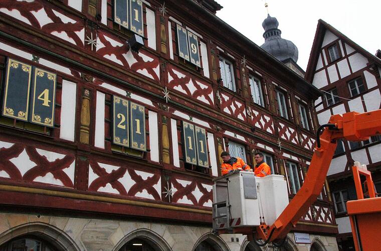 Das Forchheimer Rathaus wird zum schönsten Adventskalender der Welt umgestaltet. Ein paar Kalender-Türchen sind schon fertig. Damit die Räume bald wieder Tageslicht bekommen, werden die Nummern geschickt verteilt.