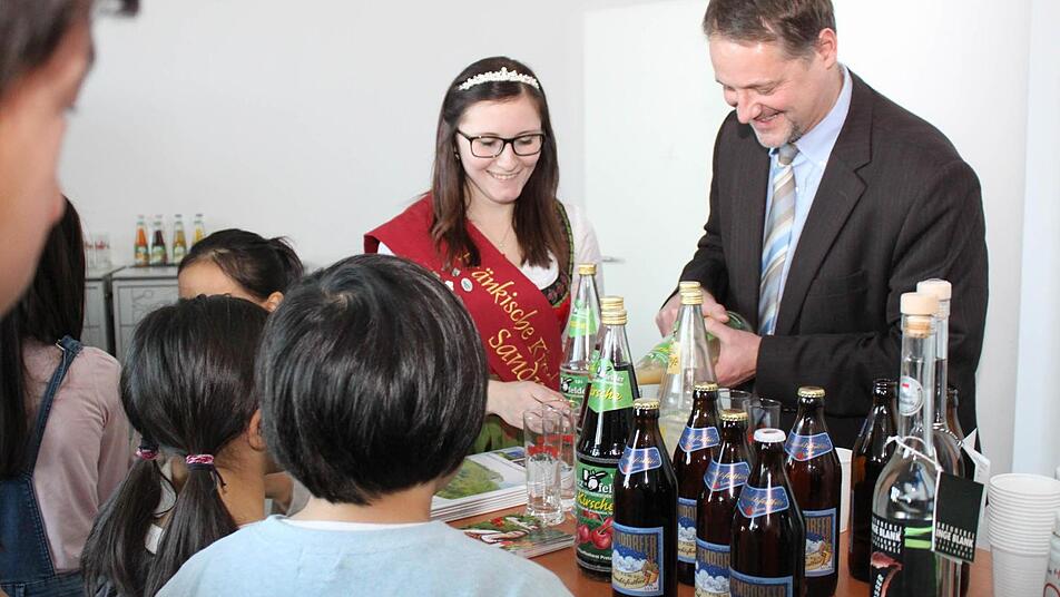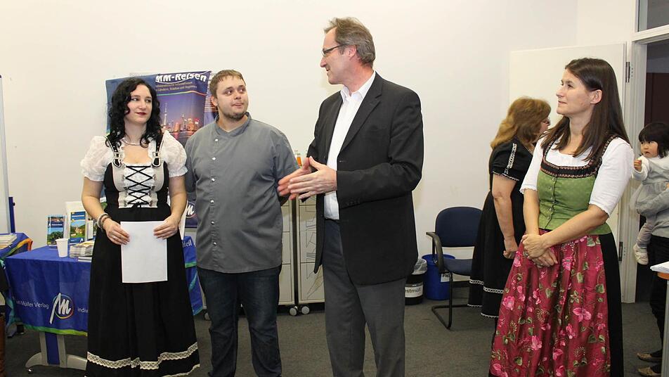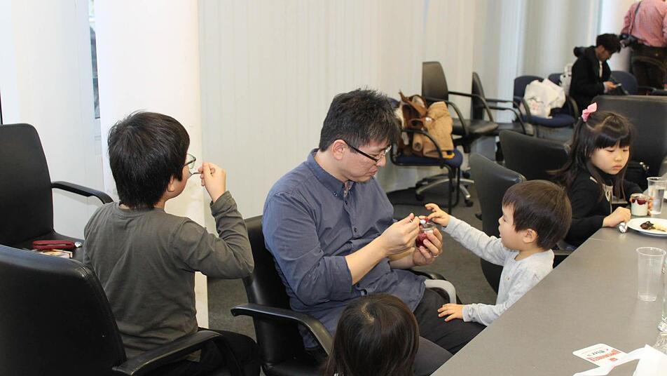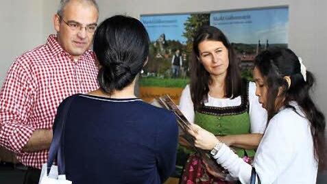 Ebermannstadts Bürgermeisterin Christiane Meyer (NLE), Forchheims Wirtschaftsreferent Andreas Rösch, Gößweinsteins Bürgermeister Hanngörg Zimmermann (CSU) und Corinna Brauer vom Michael-Müller-Verlag stellten die vielfältigen Facetten der Fränkischen Schweiz in englischer Sprache vor den Familien der japanischen Community in München vor. Ein Flyer war ins Japanische übersetzt worden. Die japanischen Kinder wollten sich auch gleich mit einer echten fränkischen Kirschenkönigin fotografieren lassen. So lächelte Sandra Grau geduldig in die Kameras der japanischen Eltern.