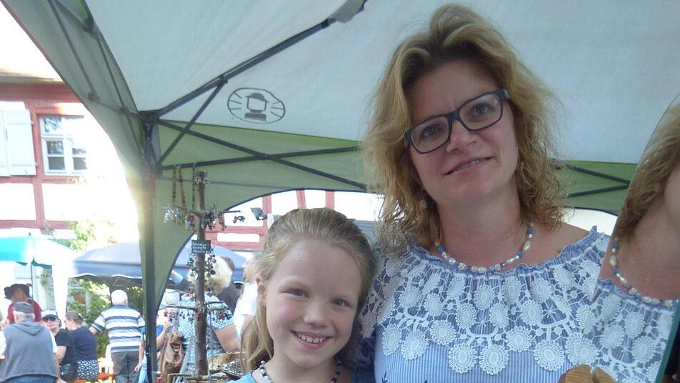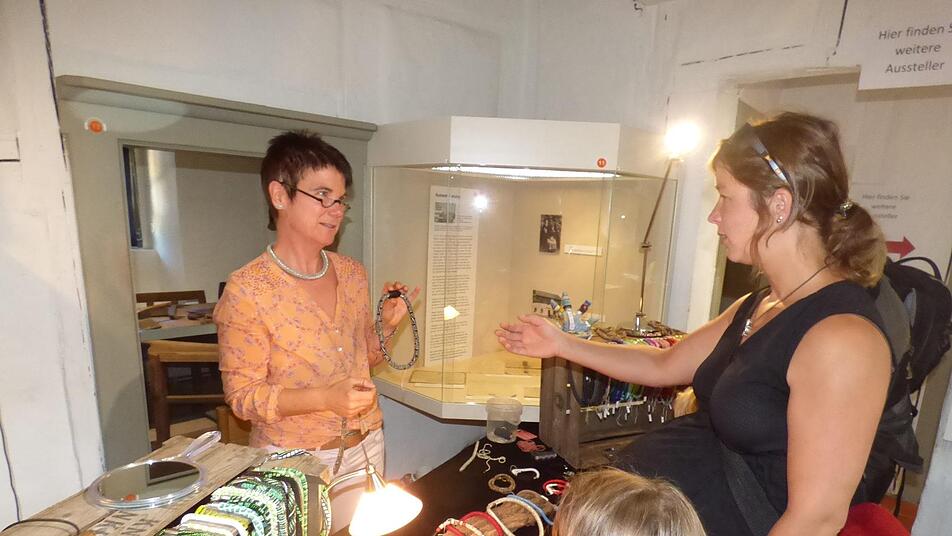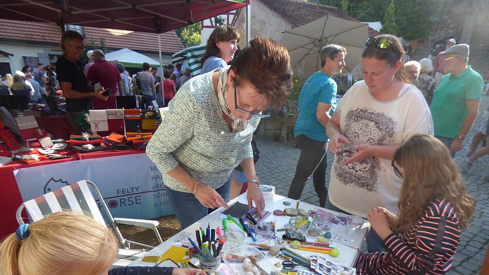 Auch das erste Mal dabei war Simone Leisner-Schmitt mit ihrer Tochter Lena-Marie. Sie stellt Unikatschmuckketten aus Natursteinen her und zeigte sich vom Handwerkermarkt total begeistert. "Das Ambiente ist sehr schön und alle sind sehr nett", sagte Leisner-Schmitt, die nächstes Jahr auf jeden Fall wieder dabei sein will. Erstmals dabei war auch ein Büttner aus dem Landkreis Neustadt an der Aisch. Neu war auch ein Stand, an dem die Besucher Filzen konnten, und Nina Stein aus Rothenburg ob der Tauber mit ihren Edelsteinen. Auch Staudengärtnerin und Gartenpädagogin Martina Pausch aus Althaidhof bei Creußen war mit ihrem Staudenverkauf sehr zufrieden, ebenso wie "Die Fuchsa": So nennt sich Ursula Bohn aus Waischenfeld, die bunte Taschen herstellt und die schon lange zum Handwerkermarkt ins Museum kommt. Auch sie sprach von einem guten Geschäft. Der freischaffenden Künstlerin Liane Thalmeyer konnten die Besucher beim Malen über die Schulter schauen. Kunstwerke zum Verkaufen hatte sie nicht mitgebracht, sie war nur zu Werbezwecken dabei. Sie schwärmte ebenfalls von der gemütlichen Atmosphäre und dem schönen Ambiente im Museum. Auch für Kinder war mit dem Kinderschminken, dem Malen oder Kettenbasteln sehr viel geboten. Auch diese Stationen waren immer besetzt. Und für die musikalische Umrahmung sorgte das David-Motsonashvili-Jazz-Duo mit dezenter Hintergrundmusik im Museumshof, ebenso Claudia Fleischmann mit ihrer Schwabachtaler Drehorgel.