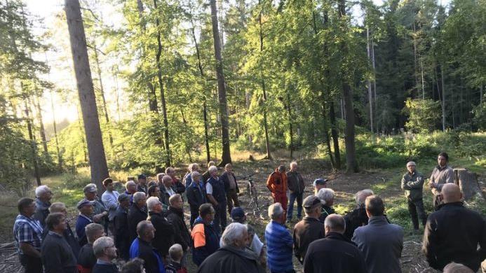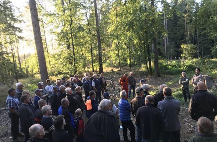 Das Thema Jagd erzürnte die Anwesenden zusehends. Alle wussten ihre Geschichten zu erzählen und beschwerten sich über die Jäger, die nicht für den Wald jagen würden. "Habt ihr auf dem Weg hierher einen Hochsitz gesehen?", fragte Heinz Pöhlmann, "was tun also die Jäger für unsere Wälder? "Mit welchen Baumarten wollen Sie die Fläche wieder aufforsten?", fragte Jessen dann den Waldbesitzer Christian Kalb. Dass er sich schon von mehreren Förstern habe beraten lassen, aber noch immer nicht die Zeit gefunden habe, sich um den Wald zu kümmern, war die Antwort. Es war ihm geraten worden, mindestens vier verschiedene Baumarten auf die Fläche zu pflanzen. Dabei waren Kirsche, Ahorn, Douglasie und Rotbuche im Gespräch gewesen.