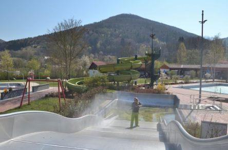 Das Freibad-Team arbeitet laut Pressemitteilung der Stadtwerke Ebermannstadt mit Volldampf, um wie jedes Jahr als eines der ersten Bäder im Landkreis Forchheim die Pforten öffnen zu können. Voraussichtlicher Saisonbeginn ist am Mittwoch, 1. Mai, sofern das Wetter mitspielt. Es wird derzeit geputzt und geschrubbt, es werden Winterschäden repariert sowie alle Wasserbecken und die Beckenumgänge mit dem Dampfstrahler einer Grundreinigung unterzogen. Mithilfe eines Feuerwehrschlauches füllen sich derzeit die Becken. 1,7 Millionen Liter Wasser werden benötigt, bis im Schwimmbad geplanscht, gespielt und geschwommen werden kann.