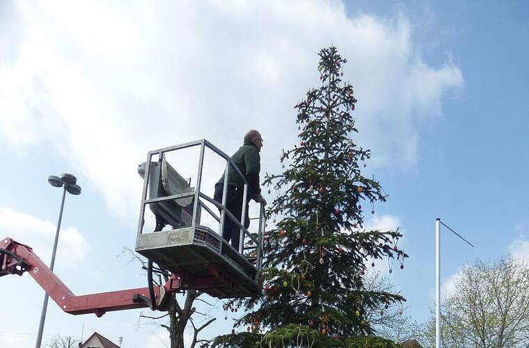 "Echte Eier auszublasen und anzumalen, dafür hatten wir keine Zeit mehr, weil die Idee ja spontan erst kürzlich bei einer gemütlichen Runde entstanden ist", sagt Heckel. Der Morschreuther Osterbaum soll aber keine einmalige Aktion bleiben, sondern auch nächstes Jahr wieder mit bunten Ostereiern geschmückt werden - dann allerdings mit echten und handbemalten Hühnereiern. So einfach ist das aber gar nicht, eine solch hohe Tanne rundherum und gleichmäßig verteilt mit Ostereiern zu behängen. Deshalb hatte Heckel für die Schmückaktion einen Kranwagen einer Firma besorgt. Zu Ostern bemalte Eier an die Bäume zu hängen, ist nicht abwegig und hat sogar einen früheren Ursprung als das Schmücken eines Osterbrunnens. Denn in der christlichen Religion steht der Osterbaum nicht nur für den Frühlingsbeginn, sondern bezeichnet den Zeitpunkt von Tod und Auferstehung Jesu Christi. Ein Osterbaum, und noch dazu ein so hoher mit Weihnachtsbeleuchtung, dürfte jedoch einzigartig in der Region sein.