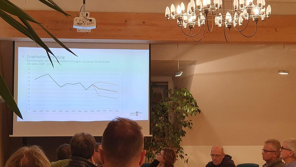 Er zeigte eine grafische Darstellung und erläuterte, dass die Quellschüttung leicht abfallend ist: "Das kann man auch nicht mit einer Quellsanierung beeinflussen." Man könne wohl die Quellleistung steigern, allerdings könne man den Quellhorizont nicht umkehren. Dazu wären mehr Niederschläge nötig.