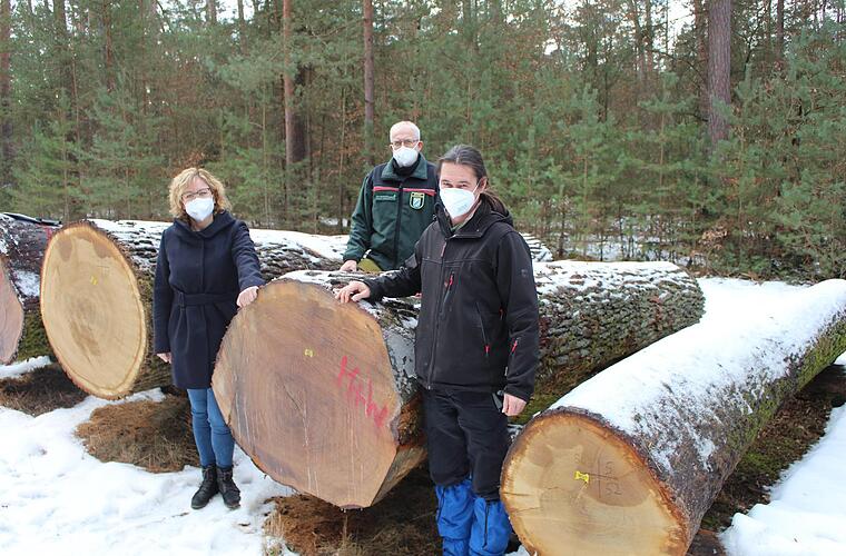 Besonders freut sich Bürgermeisterin Anja Gebhardt (SPD) über den teuersten Stamm der Submission:. Der stammt nämlich aus dem Gemeindewald Kirchehrenbach. Der Eichenstamm, der 4,8 Meter lang und 73 Zentimeter dick ist, brachte stolze 1480 Euro je Festmeter, insgesamt knapp 3000 Euro. Den Stamm hatte der Revierleiter Forstamtsrat Jörg Dettloff vom Amt für Ernährung, Landwirtschaft und Forsten Bamberg (AELF) im Rahmen eines Hiebes im Gemeindewald gemeinsam mit dem Waldausschuss ausgewählt.
