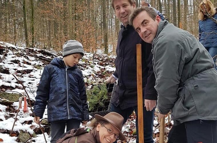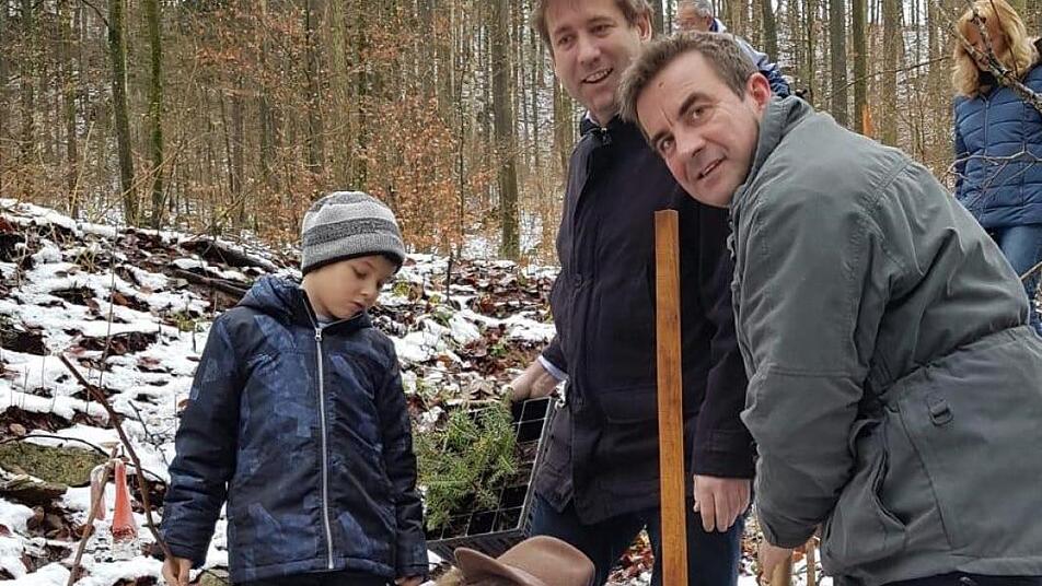 Landrat und Waldbesitzer Hermann Ulm (CSU) hatte die Idee, statt Werbegeschenken kleine Weißtannen bei anstehenden Wahlveranstaltungen zu verteilen. 24 davon hatte sich Diana Könitzer, Vorsitzende des CSU-Ortsverbands Pretzfeld, geschnappt, um sie zwischen Pretzfeld und Egloffstein als Einfriedung des entstehenden Begräbniswaldes "Friedleite" einzupflanzen.