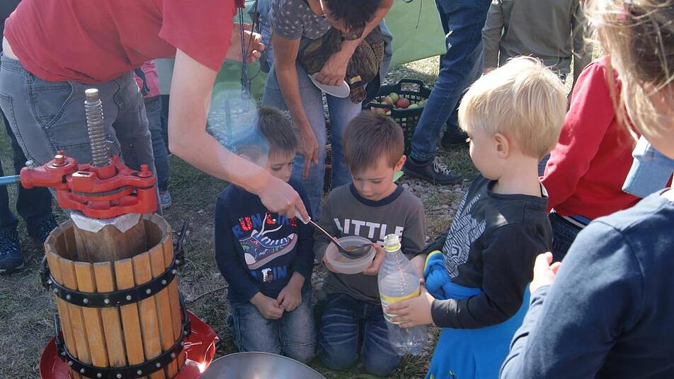 Am begehrtesten war die Station "Apfelsaft selbst pressen". Nach dem Zerteilen wurden die Äpfel in einen Handschredder gefüllt und zerkleinert. Anschließend kam der Apfelbrei in eine Handpresse und wurde mit einem Hebel von den Kindern ausschließlich mit Muskelkraft ausgepresst.