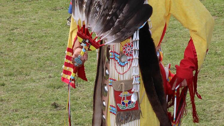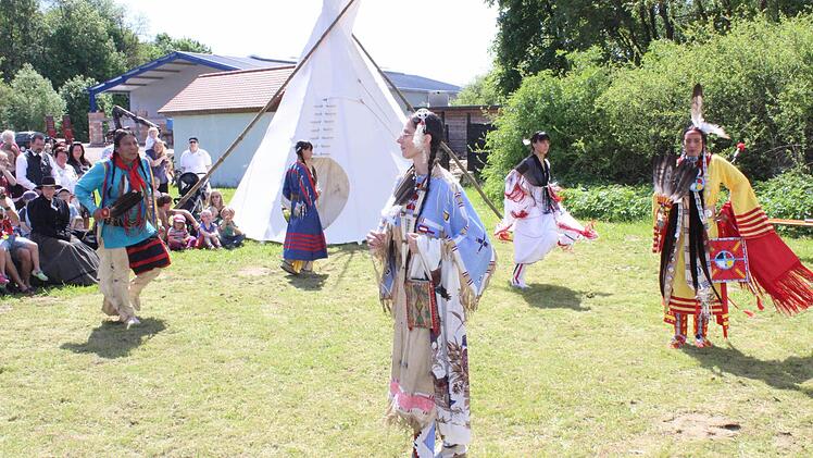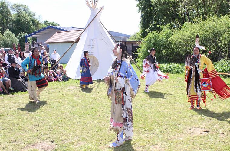 Aber auch unter diesen Bedingungen bleibt es dabei: Die Fest- und Tanzwiese am Fuße des Camps und die romantisch zwischen den Bäumen und Büschen angeordneten Tipis mit ihrer typischen kegelförmigen Anordnung der Holzstangen bieten einen wunderschönen Hintergrund für die indianischen Tanzdarbietungen.