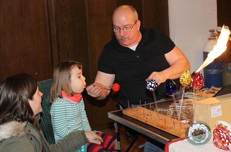 Vorbei an Osterhasen, Puppen, Bären, Tassen, Marmeladen, Bildern, Patchwork- oder Papierarbeiten gelangte der Besucher auch an den Stand des Glasbläsers Udo Gering. Hier fanden sich viele Kinder ein, denn sie durften nicht nur zuschauen, sondern selbst Glas blasen.