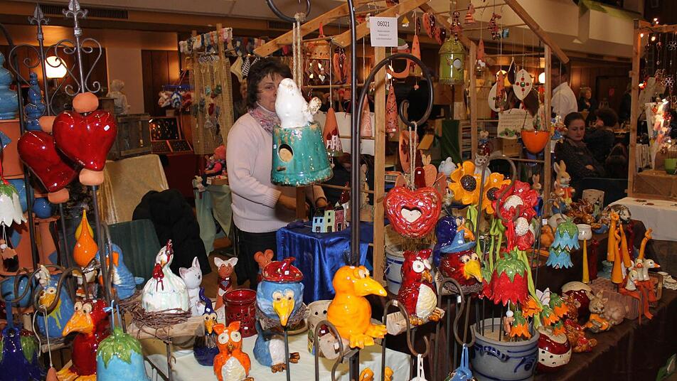 Etwas weiter zeigte Evelin Baumgärtner Blüten aus Keramik für den Garten. Seit zehn Jahren gießt sie Keramik in Blütenformen. "Die werden dann bei 1050 Grad gebrannt, danach gefärbt und nochmal gebrannt", erklärte Evelin Baumgärtner den Kunden. Sie sei gerne in