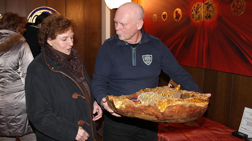Auf zwei Ebenen zeigten die Künstler ihre Werke und begeisterten die Besucher. Hans Erhardt beispielsweise vergoldet Schwemmholz. Zuhause hat er keinen Platz mehr für seine Unikate, deshalb schlug seine Ehefrau vor, dass er doch ausstellen und einige Stücke verkaufen könnte. Wer sich die Holzteile genauer ansieht, kann in der einen Wurzel Pinocchios lange Nase oder in der anderen eine Hexe sehen.