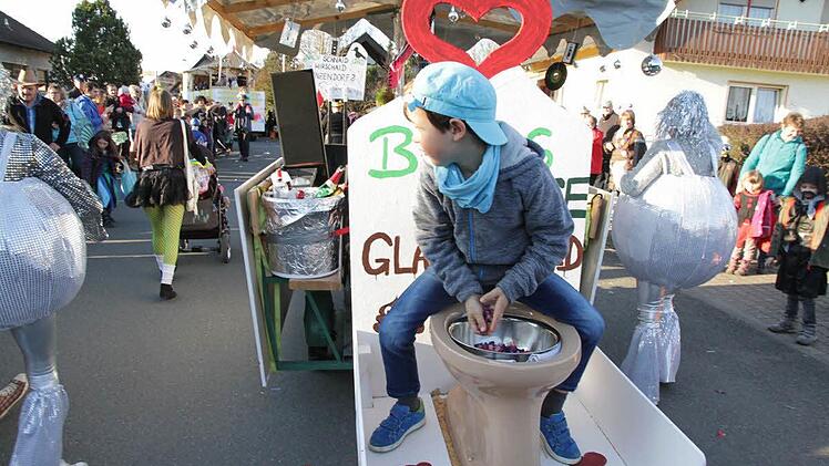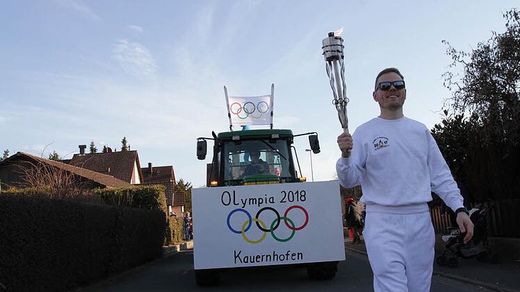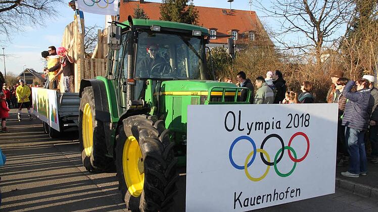 Gleich zwei Wagen kamen aus Kauernhofen: Sie bewerben sich für Olympia 2018. Aber auch ein Gefährt aus der "Schirnaidler Weltstadt" reihte sich in dem Tross mit über zehn Fahrzeugen ein. Auf dem Wagen mit den Kindern aus dem Ort heizte DJ Michael Hofmann mit Faschingshits ein, und aus dem benachbarten Landkreis waren die "Faschingsmuffl Glaabuffld" gekommen. Sie hatten am Wochenende beim großen Umzug in Hirschaid mit ihrem Wagen den ersten Preis gewonnen.