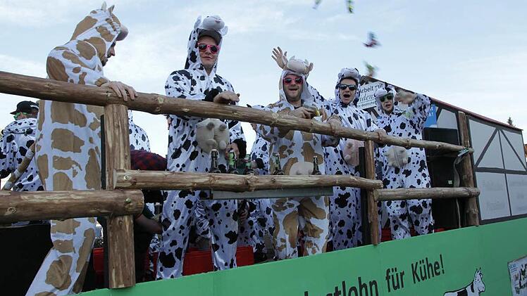 Der 30. Faschingsumzug in Neuses setzte sich am Rosenmontag in Bewegung. So viele Motivwagen wie noch nie konnten die Besucher vom Straßenrand aus bewundern. Natürlich mit dabei die beiden großen Wagen der Stammtische "Montagsgullies" und "Schdamberla". Das Pendant dazu waren die "Weinbüchsen" vom Neuseser Frauenstammtisch.