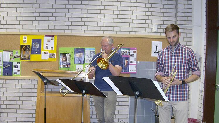 Der Refrain folgt und die beiden Realschullehrer Wolfgang Distler und Christian Libera setzen mit ihrem Posaunen- und Trompetenspiel eigene Akzente.