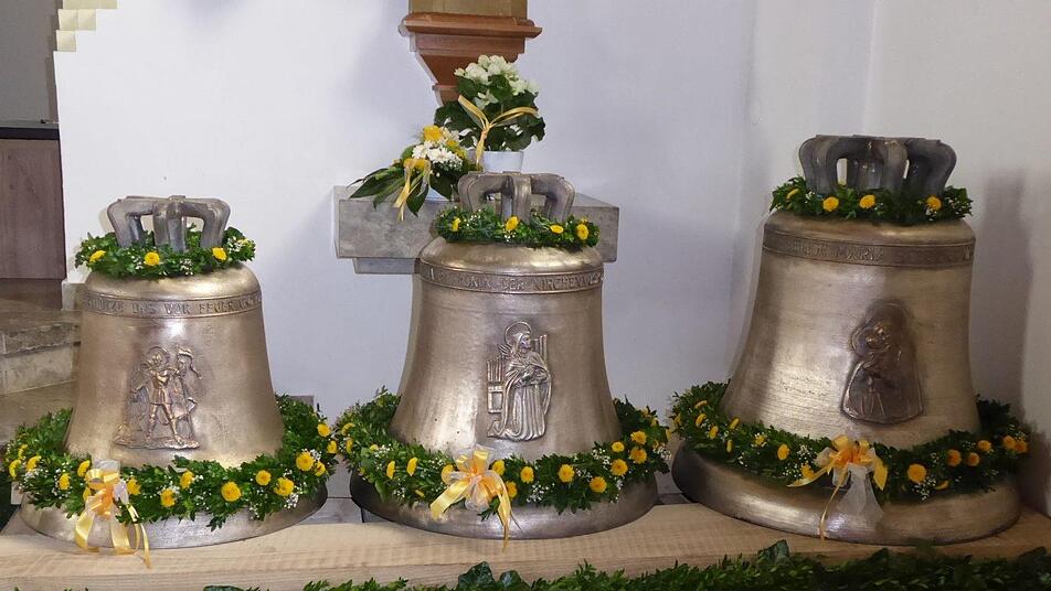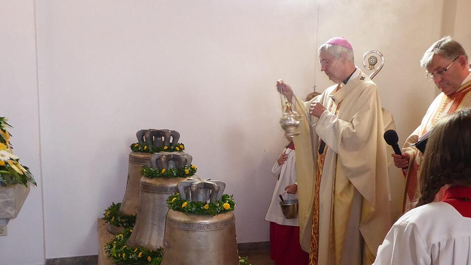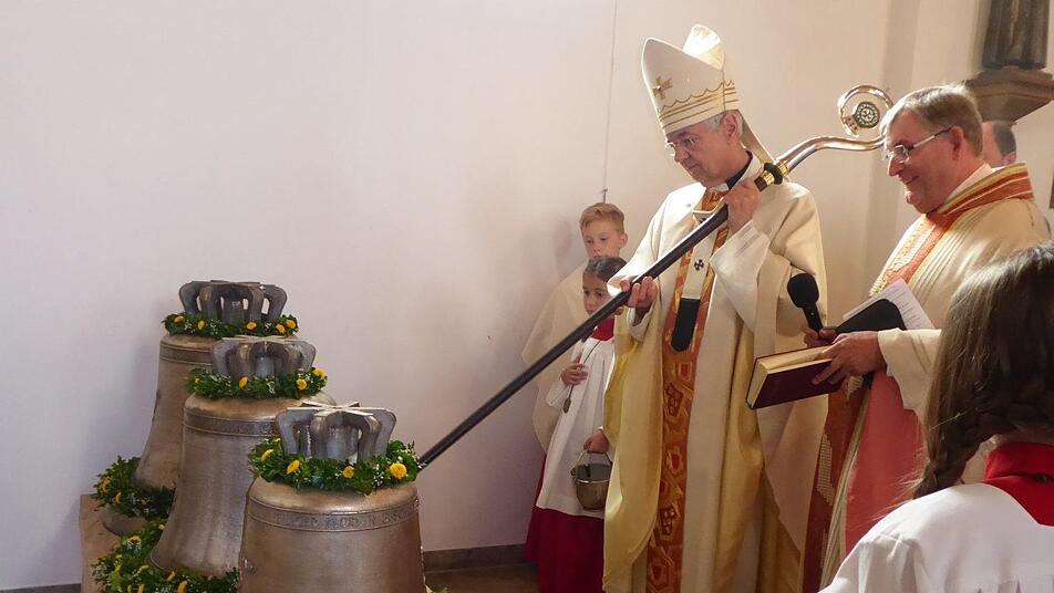 Galt es doch, gleich drei neue Glocken in einem feierlichen Ritus in der Kirche zu weihen. Gemeinsam mit Ortspfarrer Werner Wolf hatte der Bamberger Oberhirte den Pontifikalgottesdienst gefeiert, zu dem noch einmal die alten Glocken riefen und der von der Singgruppe Geschwand unter Ludwig Ebenhack und von Organist Richard Mager mit Chor- und Orgelmusik sehr schön mitgestaltet wurde. Gemäß dem mittelalterlichen Glockenspruch "Die Lebenden rufe ich, die Toten beweine ich, die Blitze breche ich, sollen die neuen Glocken die Lebenden zu Gott, zum Gottesdienst und Gebet rufen sowie an den Himmel erinnern", so Schick. "Sie sollen die Toten beweinen und zugleich die Hinterbliebenen mit der Botschaft der Auferstehung der Toten und dem ewigen Leben trösten. Sie sollen die Blitze brechen, im übertragenen Sinn dazu aufrufen, die Versuchungen zum Bösen und Schädlichen zu brechen, um gut zu handeln, gut zu leben, gut zu bleiben."