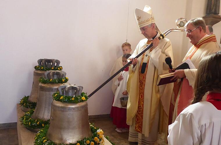 Schon eine Stunde vor Gottesdienstbeginn kamen die ersten Besucher. Es waren mehr als 500, die zur Glockenweihe strömten. Bald konnte das kleine Gotteshaus die Gläubigen nicht mehr fassen, so dass für die vielen anderen vor der Kirche Bänke aufgestellt wurden. Für sie wurden die Feierlichkeiten per Lautsprecher nach draußen übertragen. In ihren Begrüßungsreden dankten der stellvertretende Pfarrgemeinderatsvorsitzende Markus Habermann und Bürgermeister Markus Grüner dem Erzbischof für sein Kommen und wünschten gleichermaßen, die neuen Glocken mögen für die Geschwander nicht nur beim ersten Mal, sondern für alle Zeiten in Frieden läuten und die Gemeinde zu Gott hingeführt werden.