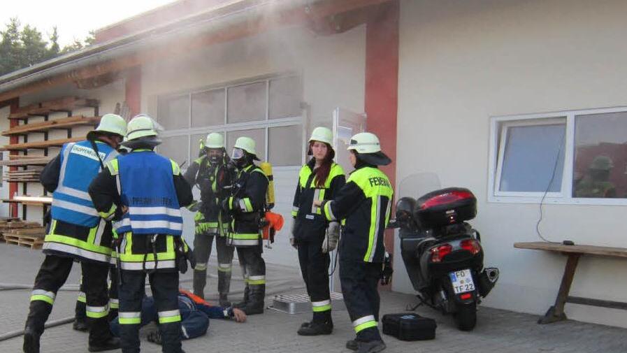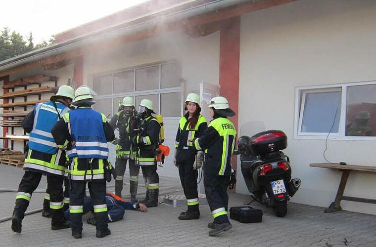 Sein Sohn Maximilian, Gruppenführer bei der Ortswehr, hatte erstmals die Leitung eines so großen Einsatzes inne. Als "Brandobjekt" für die Übung war die Zimmerei Friedemann ausgewählt worden. Neben der mittelschweren Brandbekämpfung galt es, fünf Personen im Fabrikgebäude mit schwerem Atemschutz und mittels technischer Hilfeleistung zu suchen und zu befreien.