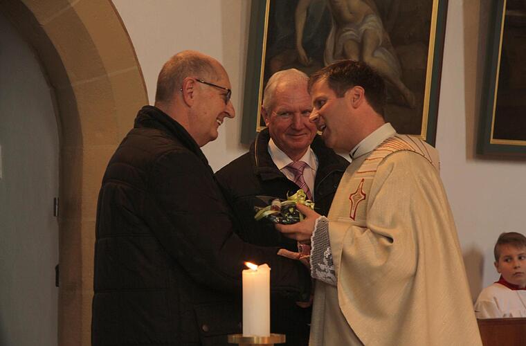 Sie bekamen als Dank und Anerkennung vom Geistlichen ein persönliches Präsent. Allerdings nicht ohne Hintergedanken. "Mit Speck fängt man Mäuse", scherzte Steffel. Er hofft natürlich, dass die beiden noch viele Jahre ihre Ämter in der Pfarrei ausführen werden.