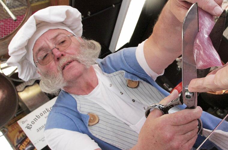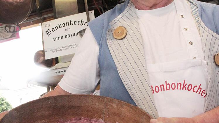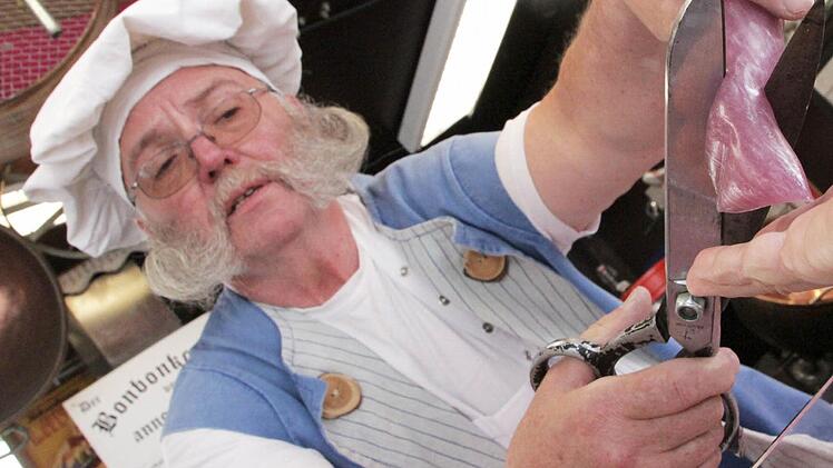 Hans Joachim Kurkowski, der Mann mit dem mächtigen Rauschebart, ist zweifelsohne eine der Haupt-Attraktionen des Handwerkermarktes rund um die Kaiserpfalz. Der Bonbon-Kocher aus Lauingen gießt die 150 Grad heiße Zuckermasse mit Himbeergeschmack auf die drei Zentner schwere Marmorplatte in seiner mobilen Bonbon-Fabrik, knetet den Teig und dreht ihn durch eine Walze. Er schneidet für die Zuschauer aber auch ein Stück von der Kau-Masse ab und lässt die Zaungäste einen Lutscher daraus formen. Nebenbei erzählt er, wie er Bonbon-Kocher wurde und woher er die Rezepte hat.