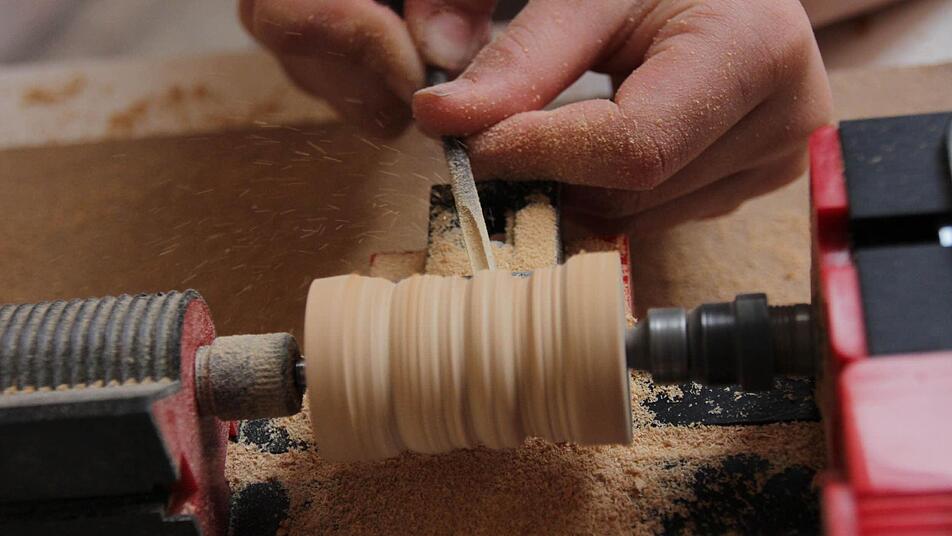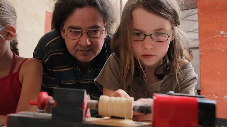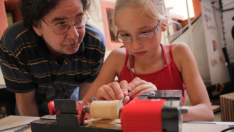 Kreativität schreibt auch Möbelschreiner Ludwin Sartoris groß. Der "Holzwurm" mit Wandobjekten, Skulpturen und Kleinmöbeln wirbt auch für seine "Vulkaneifel-Akademie" für Kunst und Handwerk. Damit Kinder den Werkstoff Holz entdecken, dürfen sie an seinem Stand drechseln.