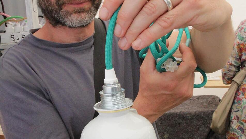 Bei der Dipomdesignerin Katrin Lütjohann aus Erlangen und dem Karlsruher Friedrich Emde verbinden sich Kunst und der Sinn für das Praktische. Beide können offenbar nichts wegwerfen. Deshalb verwandelt Lütjohann ausgediente Pinsel in Deko-Objekte, und Emde lässt mit viel Phantasie aus alten Tassen, Deko-Leuchten entstehen, kombiniert Aktenordner und Hosenträger zu einem Notizbuch und gibt ausgedienten Waschlappen mit Metallschnalle und Kugelkettchen ein zweites Leben als Brustbeutel für die wertvollsten privaten Dinge.