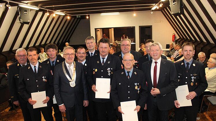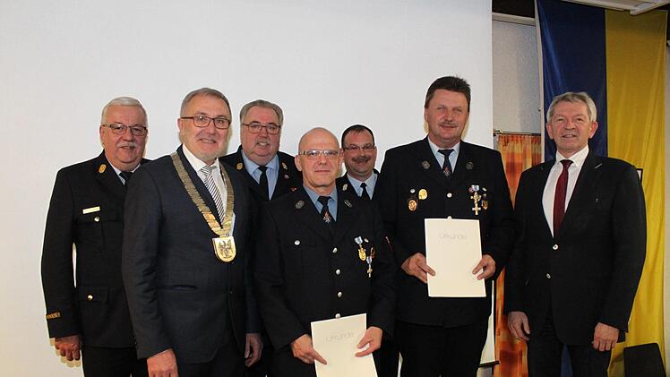 Danach zeichnete er gemeinsam mit Bürgermeister Helmut Krämer, Kreisbrandinspektor Reinhold Schumm, der selbst für 30 Jahre Dienst geehrt wurde, und Kreisbrandrat Bernhard Ziegmann fünf Feuerwehrler für 25 Jahre Dienst aus. Roland Baier und Andreas Schick erhielten ein Ehrenabzeichen für 40 Jahre Dienst bei der Feuerwehr.