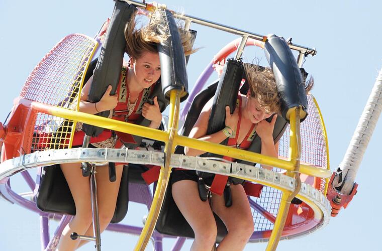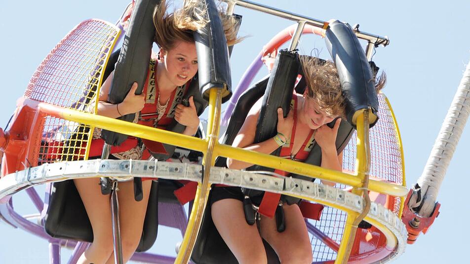 Zugegeben. Anfangs ist den beiden Mädchen Alexandra und Alisa schon etwas mulmig, als sie die "Kanonenkugel" des "Hot Shot" auf dem Annafest besteigen. "Das Warten auf den Abschuss ist Nervenkitzel pur. Du weißt, dass du gleich auf 50 Meter Höhe katapultiert wirst. Da steigt der Adrenalin-Spiegel", räumt Alisa ein. "Aber dann ist es nur noch geil!"