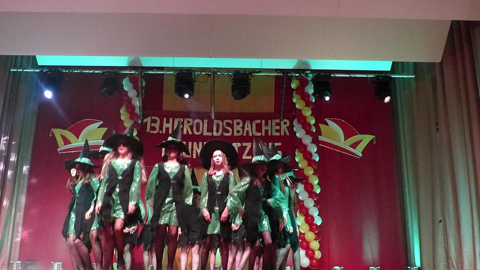 Die Wichtelgarde lockte die Zuschauer in sommerliche Gefilde. Doch dann war es mit der sommerlichen Heiterkeit vorbei, wilde Hexen fegten über die Bühne, und das, obwohl der Saal doch die Tanzelfen erwartete. Nicht nur das leuchtende Grün der Hexenkleider verriet, dass sich die jungen Tänzerinnen nicht nur elfen-zarten Themen stellen, sondern akrobatisch über die Bühne rocken.