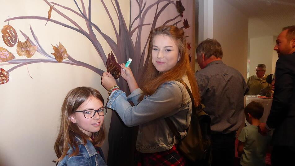 Im Eingangsbereich konnte ein an die Wand gemalter großer Baum bewundert werden. Er war kahl. Das hatte aber auch seinen Sinn: Während des Gottesdienstes wurden gepresste Blätter verteilt. Mit Namen und Wünschen versehen, durften sie von Kindern und Erwachsenen an die leeren Äste des Baumbildes geklebt werden. Der Ansturm war riesig.