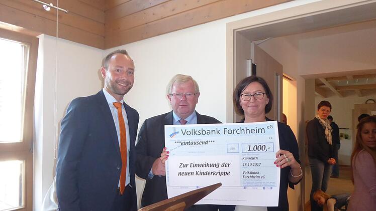 Mit dem Wunsch nach "einem guten Start" überbrachte Christian Drummer von der Volksbank Forchheim einen symbolischen Scheck von 1000 Euro mit, den er an Bürgermeister Ochs und Kindergartenleiterin Sabine Duddeck übergab.